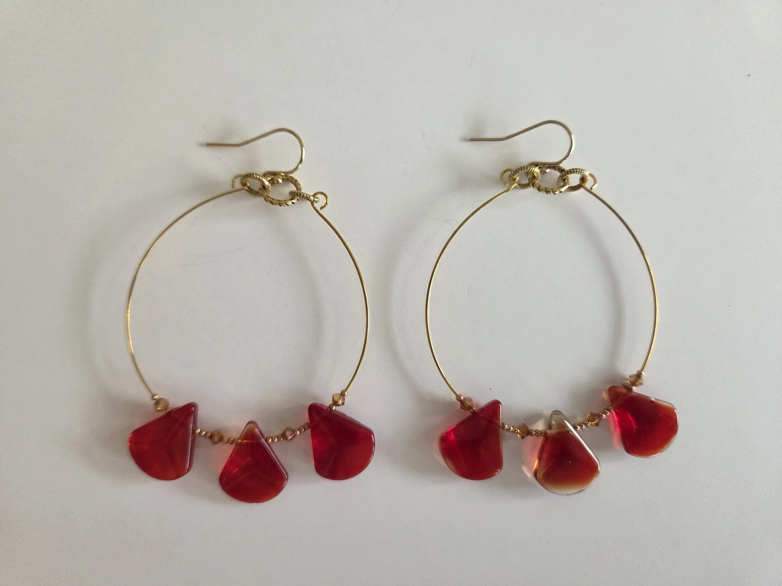 These teardrop shaped earrings are created with red Chinese crystals that are encased inside silver arcs. Ear wires are sterling silver. Earrings measure 2-1/4” high and 1” wide.